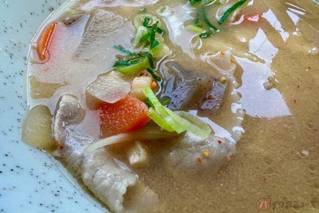 みそ汁の代わりに具だくさんでボリュームいっぱいの豚汁は、根菜やこんにゃく、豚肉などがお椀ではなく丼に入っていて、ご飯のおかずにもなり箸が進みます。