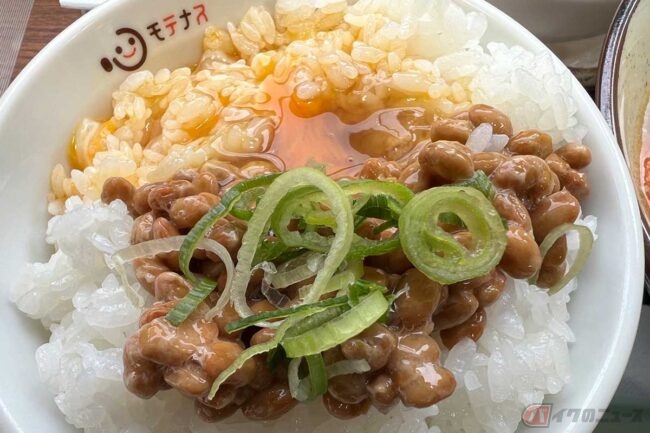 納豆と生卵はそれぞれよくかき混ぜ、両方とも温かいご飯の上に「ON」しました。納豆だけでも十分美味しいところ、そこに溶いた卵が加わるとさらに旨味が増して大満足です。
