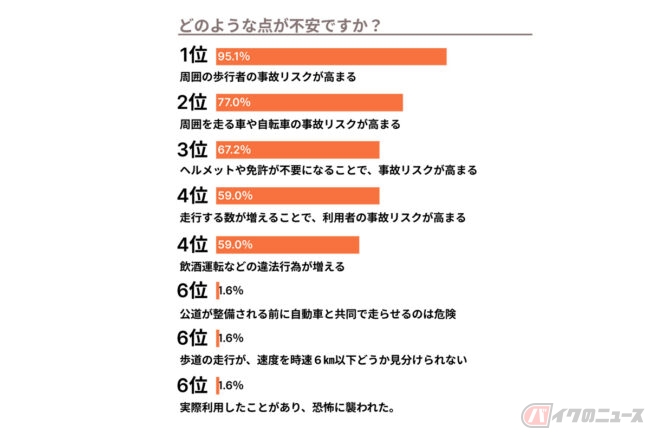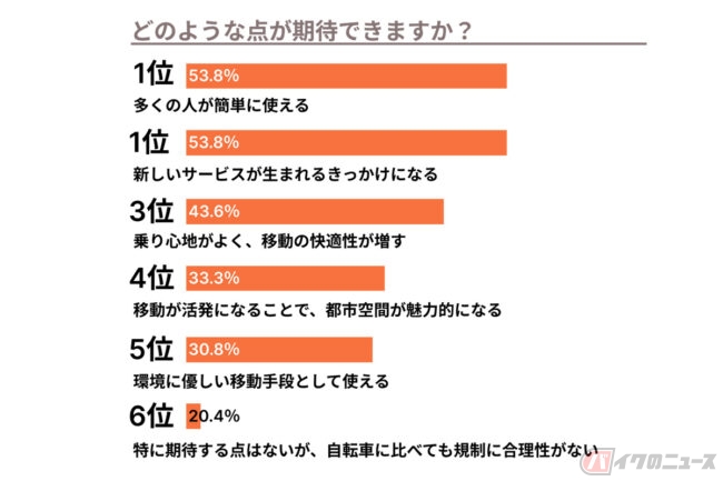 期待の1位は「多くの人が簡単に使える」「新しいサービスが生まれるきっかけになる」が同率とイノベーションへの期待が伺えた一方で、不安の1位は「周囲の歩行者の事故リスクが高まる」など事故に関するものが上位を締めています。