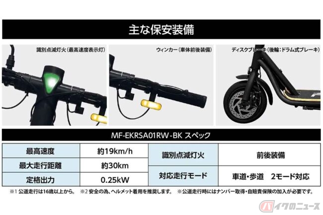 7月からは電動機の定格出力が0.6kW以下であって長さ1.9m、幅0.6m以下かつ最高速度20km/h以下のものを特定小型原動機付自転車として扱うことになりますが、MEISTER.Fでは識別点滅等火(最高速度表示灯)、ウィンカー(車体前後装備)、ヘッドライト、バックミラー、警音器、テールランプ、ナンバー灯を装備することで規定に対応。