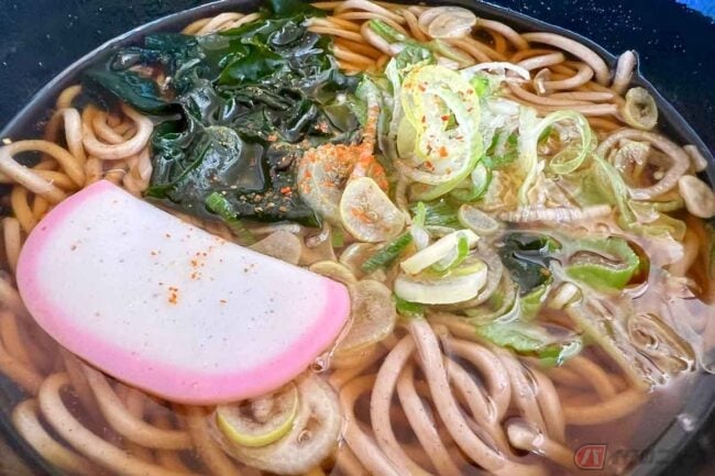 東名高速道路の「鮎沢PA」は、下り・上り線ともにボリュームタップリの食事が楽しめる食堂があります。今回立ち寄った下り線施設の、地域にぴったりなネーミングの「山小屋食堂」で、リーズナブルな「かけそば唐揚げセット」(720円)をオーダーしました。