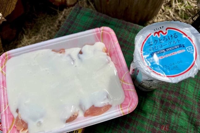 鶏肉はヨーグルトに浸けることでしっとりと柔らかくなります。ヨーグルトに含まれるタンパク質が肉の保水効果をもたらすそうです。本来ならば一晩浸けておくと良いようですが、今回はキャンプ場で設営と準備をしている2時間ほどです。