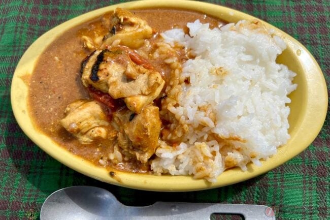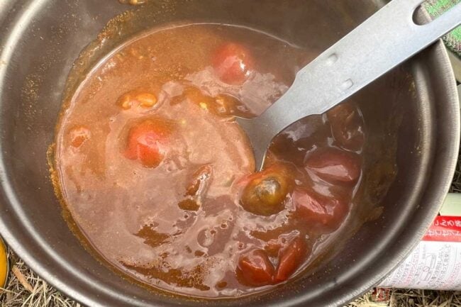 コッヘルでレトルトカレーを煮込む際には、カレーパウダーやホットガラムマサラ、そしてミニトマトを潰して入れました。また、鶏肉はスキレットで少し焼いてから投入しました。残りのヨーグルトをカレーに入れるかは好みで分かれると思いますが、酸味が増して少しクリーミーになるかと思い、投入しました。さらに煮込んでトマトの形が崩れたところで完成です。