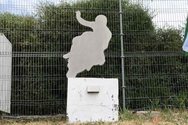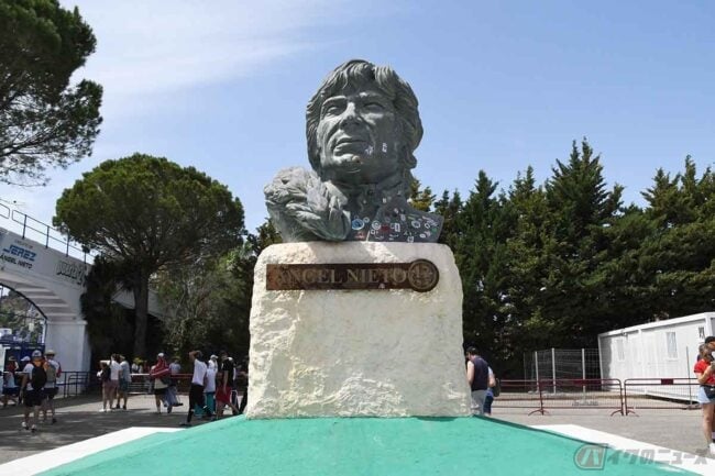 私が見つけられただけでも、ホルヘ・マルチネス、アンヘル・ニエト、アレックス・クリビーレ、それからフェラーリの跳ね馬のモニュメントなど。コースサイド以外にも、エントランスにはアンヘル・ニエトの巨大な銅像が飾られていて、フォトスポットになっていました。そしてパドックには1993年に同地で亡くなった若井伸之選手のフラミンゴ像があり、訪れると、大きな花束が供えられていました。