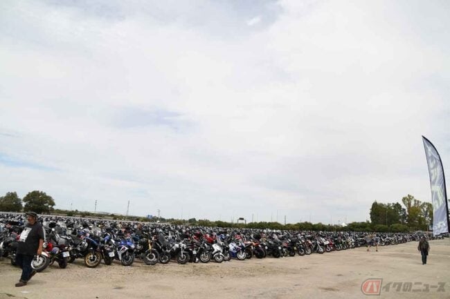 そこは「バイクの海」でした。これほど大きなバイクのための駐輪場も、これほどたくさんのバイクがひとつの場所に集まっていることも、見たことがありません。出入口らしきところが遠目に見えています。とてもじゃないけど、歩いてすぐに着ける距離ではなさそう。スポーツバイクはもちろん、様々な車種が眼前に一堂に会していました。
