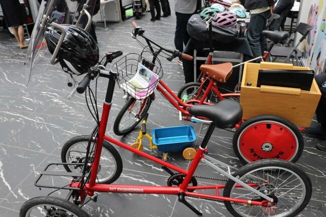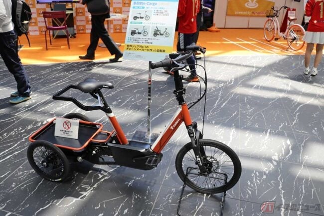 今回の展示で目を引いたのは、荷物を運搬するために開発されたe-BIKEです。現在は、あくまで個人の移動のための乗りものであり、何かを運ぶとしても前後のカゴを利用した小さな荷物の運搬がメインですが、電動アシスト機能のパワーと自転車の小回りの良さを活かした利用が期待できそうです。
