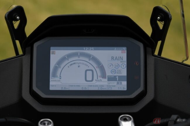 5インチのフルカラー・マルチインフォメーションディスプレイを見ながら、ハンドル左のスイッチで直感的に操作でき、ライディングモードは走行中も容易く切り替えることができました。