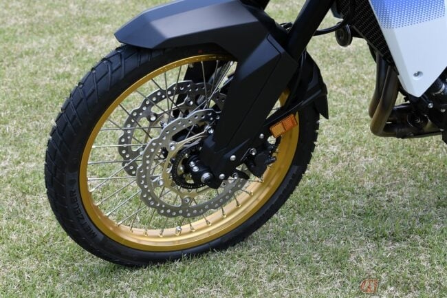フロントに21インチの大径ホイールをセットし、気兼ねなくダートを楽しめる軽快性があります。インナーチューブ径43mmのショーワ(日立Astemo株式会社)製SFF-CA倒立式フロントフォークは200mmのストローク量があり、プロリンク式のリアサスペンションもアクスルトラベル190mmと余裕を持ち、最低地上高を210mmとすることで荒れた路面も気にせずに走れる走破性が追求されています。