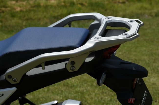 シート高は850mmで、身長175cmの筆者だとカカトが僅かに浮く程度。足つき性に不安がないのも、引き起こしを楽にさせている大きな要因のひとつで安心感があります。座面が絞り込まれた形状で、地面に足をおろしやすいのも足つき性をより良くしています。