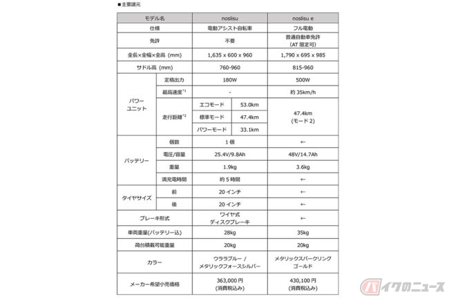 ウララブルー、メタリックフォースシルバーの2色が用意されたnoslisuの価格(消費税10%込)は36万3000円(5月20日発売)、メタリックスパークリングゴールドが用意されたnoslisu eは43万100円(2023年6月頃発売)、メタリックフォースシルバーが用意されたnoslisu cargoは41万4700円(2023年7月頃発売)となっています。