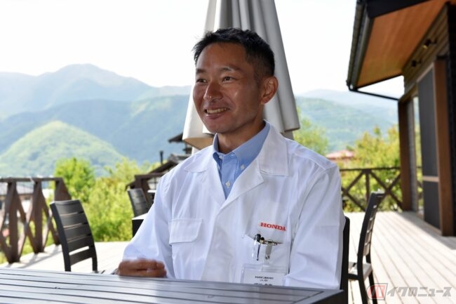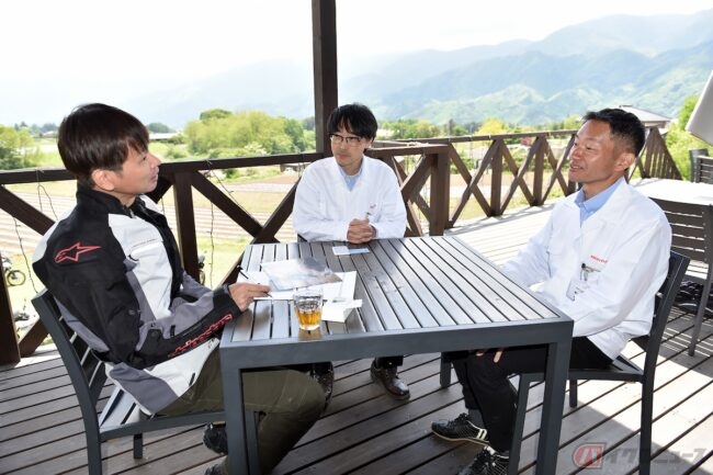 『XL750 TRANSALP』をたっぷり試乗後、そう言う筆者(青木タカオ)にあいづちを打ってくれるのは『XL750 TRANSALP』で開発責任者を務めた佐藤方哉(まさとし)さんと開発責任者代行の細川冬樹さん。ふたりとも、これまでは『CBR1000RR ファイヤーブレード』など、オンロードモデルをメインに開発してきた凄腕コンビです。今回はまったく毛色の異なるアドベンチャーの新機種を任されました。