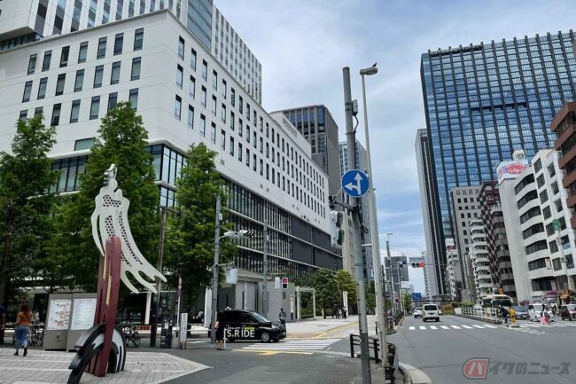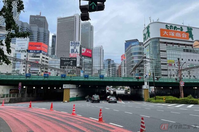 スタート地点は、2023年4月に歌舞伎町のど真ん中にオープンした話題の超高層複合施設「東急歌舞伎町タワー」です。繁華街ということもあり、人通りも多いので見物には自転車を押し歩いて行きましょう。見上げすぎて首が痛くなったら、これも新宿名所である大ガードをくぐって「青梅街道」へと進みます。