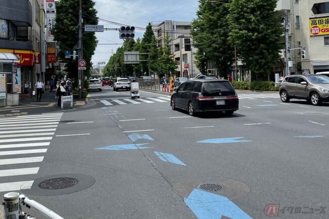 「青梅街道」と「山手通り」の交差点であるこの地点は、新宿の高層ビル群の影響なのか、なぜかいつでも強い風が吹いています。天候や風向きなど、運が良ければ(?)体が吹き飛ばされそうなほどの「鉄砲風」を味わうことができますが、自転車の走行中に横風を受けると思っている以上にハンドルを取られるので、無理せず押し歩いて交差点を渡りましょう。