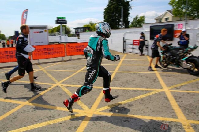 ダンロップ選手は故ロバート・ダンロップ選手の息子で、マン島TTレース最多勝利の故ジョイ・ダンロップ選手の甥でもあります。ゼッケンは今年も彼のアイコンになっている「6」番。走行前は常に先頭を陣取り、ピットに戻ってきてカテゴリー違いのバイクに乗り換えるときは全力で走ってすぐにコースインするなど、気迫を感じさせる走りを見せました。その結果、スーパーツイン、スーパースポーツ、スーパーストック、スーパーバイク全てのカテゴリーでトップタイムを刻み初日を終えました。