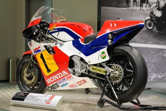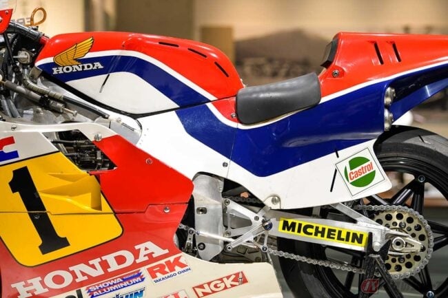 「NS500」で念願のGP500クラス初タイトルを獲得したホンダは、その翌年にV型4気筒エンジンの本命マシン「NSR500」を投入しました。天地がひっくり返った車体レイアウトを採用したマシンの活躍は、大いにレースファンを魅了するものでした。
