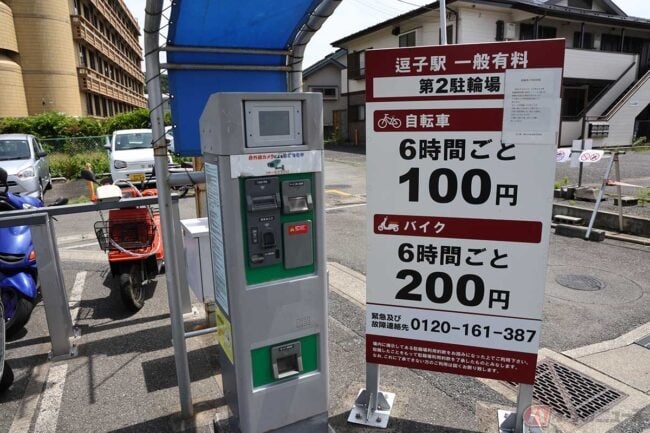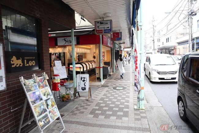美味しいアジフライを求めて、筆者(増井貴光)がやってきたのは神奈川県逗子市、「逗子駅」の東口側に面した逗子銀座通りです。ここは駅前のメインストリートで、もちろんバイクの路駐はできないので愛車のホンダ「CT110」(1986年型)はすぐ裏にあるバイク駐輪場に停めて歩いてきました。