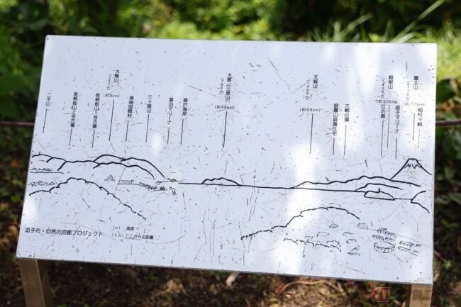 この日は富士山は見えませんでしたが、近くは葉山から江ノ島、遠くには大島まで見ることができました。案内ボードを見ると、大島の三原山までは富士山よりも近く、66kmしか離れていないのだとか。