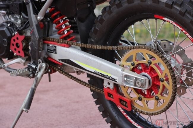 インナーチューブ径41mmの倒立フォークとピギーバック付きのモノショックはしなやかに入って、大きな負荷がかかっても底づきせず受け止めてくれるから、ダートでもアクセルは大きく開けがちになり、性能の高い足まわりはビギナーにも大きな助けとなるでしょう。