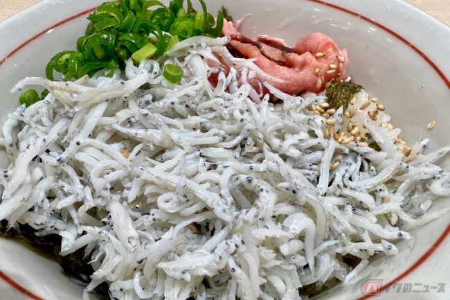 選んだメニューは「しらすたたき丼と海老フライ」(1290円)です。以前「三河しらす丼と三河フライ」(1000円)を実食し、ニギスのフライやしらすご飯の美味さが記憶に新しく、今回は海老フライをいただくことにしました。
