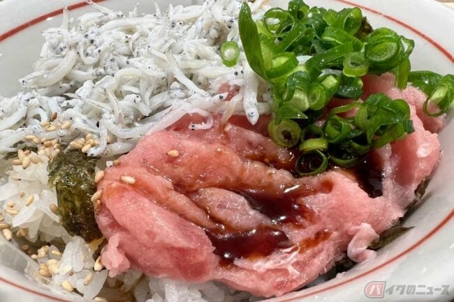 まずは「しらすたたき丼」です。三河湾産のしらすが不漁のため、現在は淡路産のしらすを使用しているそうです。味の違いは分かりませんが、十分に美味しいです。程よい塩気と癖のない味でご飯が進みます。その脇に少量ですがマグロのたたきが添えられ、海鮮丼としての魅力を増していました。