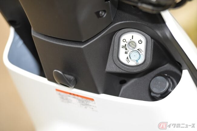 ちなみにバッテリーはシート下! 取り外すのもすごく簡単だ! 隣にはちょっとした小物入れも! 車載工具を入れるのにちょうどよさそう! ヘルメットホルダーもあるので便利です。