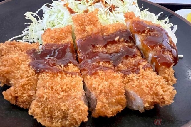 とん汁は豚肉やねぎ、こんにゃく、大根、人参など具材たっぷりで、野菜と豚肉の旨味を堪能できる一品です。七味を少々振っていただきました。メインのとんかつは肉厚の豚肉がサクサクの衣をまとい、ご飯のおかずとしては最高。付け合わせのキャベツの千切りもたっぷり盛られ、なかなかのボリュームでした。