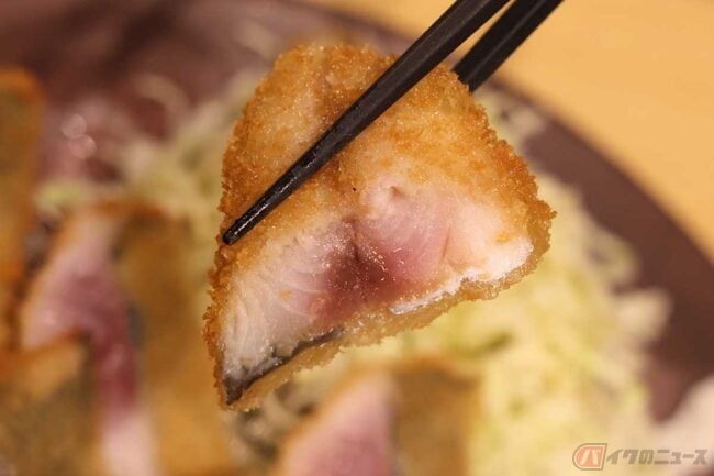 筆者はこれまで、いろいろな店でアジフライを食べてきましたが、こちらの「半生アジフライ」は今までに食べたことのないタイプです。刺身で食べる新鮮なアジを絶妙な具合で半生に揚げたアジフライです。