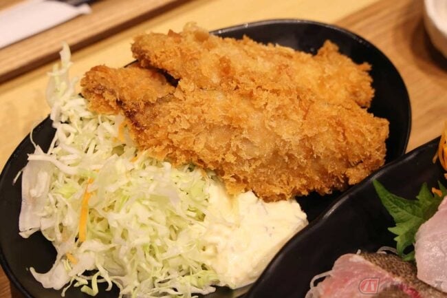 一方、「お刺身アジフライ御膳」はアジフライの半身が2枚、大きさは普通サイズです。付け合わせはキャベツの千切り。刺身はカツオ、イサキ、サワラの3種で日によって変わるようです。アジフライはサクサクの衣で身はふっくら。スタンダードに美味しいアジフライです。水産卸会社直営なので、アジフライだけでなく魚はどれも新鮮で美味しくいただきました。