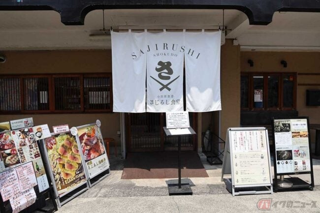 2分ほどで目的の「さじるし食堂」に到着しました。平日の昼時でピークを少し過ぎていたせいか、それほど待つこともなく入店します。「さじるし食堂」は、天正15年(1587年)に創業した、水産仲卸の会社「鮑屋」直営の食堂だそうです。
