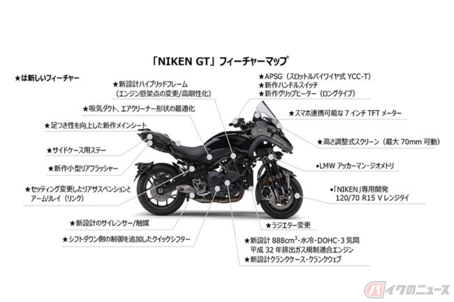 “Evolution for high-end touring”をコンセプトに開発された最新のNIKEN GTでは、排気量を845ccから888ccへ拡大しクランクマス増加によりドライバビリティを向上した新型CP3エンジン(クロスプレーン・コンセプトの3気筒)、応答性を高めた新設計ハイブリッドフレーム、セッティングを見直し、路面追従性を向上したリアサスペンションを新たに採用。