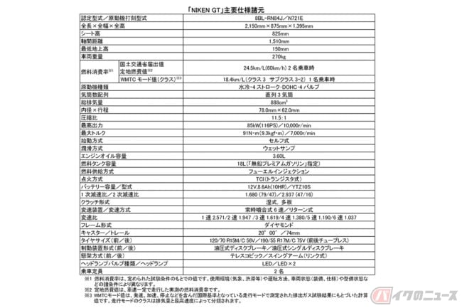 ブラックの外装色が用意されたNIKEN GTの価格(消費税10%込)は220万円となっています。