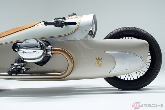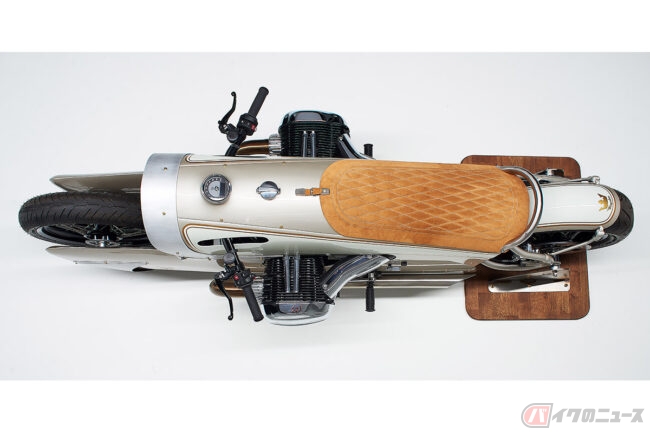 容量8Lのハンドメイド・燃料タンクと車体部品は厚さ2mmのアルミ板金で作られ、エンジンやリアサスペンションはオリジナルのものが使用されましたが、ステンレス製エキゾーストマニホールドも同じく手作業で作られています。