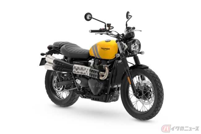 「スクランブラー900」は大胆な新色コスミックイエロー&グラファイトを追加。ジェットブラックのマッドガード、フレームカウル、リアパネルとの組み合わせにより、頑強さがさらに引き立つデザインとなっています。