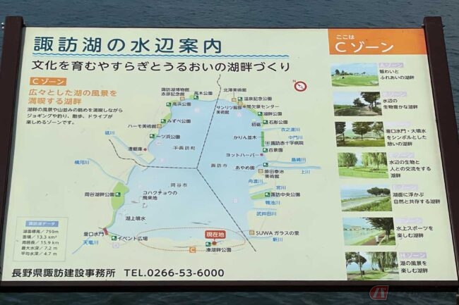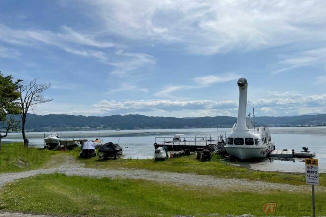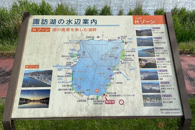 「諏訪湖間欠泉センター」を過ぎると、すぐに「諏訪市湖畔公園」に差し掛かります。遊覧船乗り場やモニュメントが出迎えてくれるこの公園あたりには多くの飲食店などが並び、湖畔周辺でひと際賑わいを見せるエリアになるかと思います。長野名物の蕎麦などでお腹を満たすのにぴったりです。