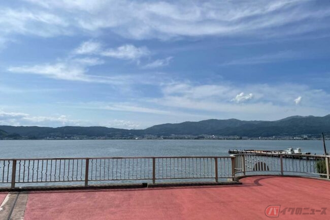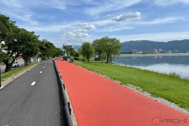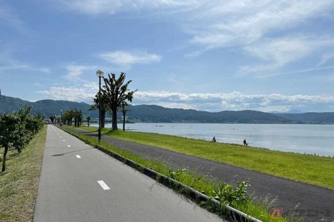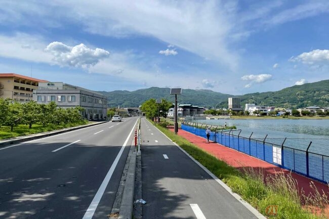 そして自転車専用道の爽快感です。都内にも「荒川サイクリングロード」や「多摩川サイクリングロード」などがありますが、ウォーキングなどほかの利用者と共用です。諏訪湖のサイクリングロードは自転車専用の道が整備されているので、気兼ねなく走ることができます。
