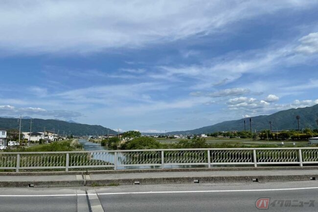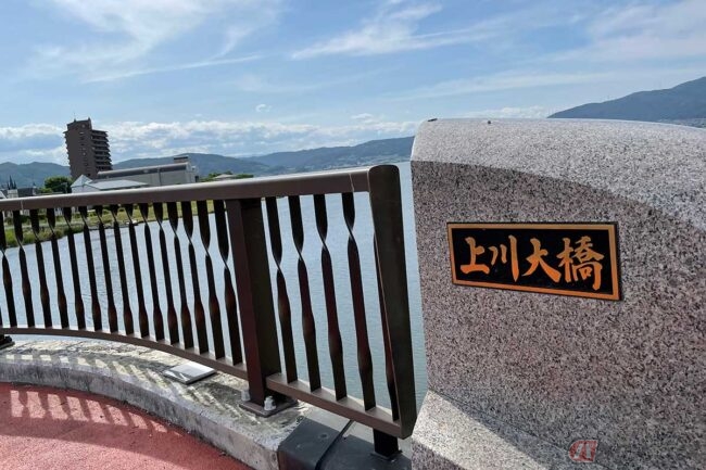 気を取り直して走りはじめると、湖に注ぎ込む川を渡るための「上川大橋」に向かう坂に差し掛かります。少し気合を入れて漕ぐ足に力を入れる必要があり、じつは諏訪湖1周のサイクリングロードで一番大きな坂です。
