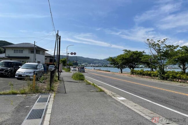 このあたりで「時計回り」でスタートしたことを後悔しはじめます……前述のとおり、諏訪湖サイクリングロードは一部が整備中で全線開通していません。工事中の区間では車道に移って走ることになります。