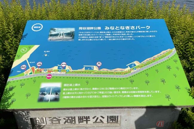 遊具で遊ぶ子供連れや湖畔を散策する人が穏やかに時間を過ごす「岡谷湖畔公園」を過ぎると、そこはスタートした「赤砂崎公園」です。これにて諏訪湖1周、いわゆる「スワイチ」完遂です!