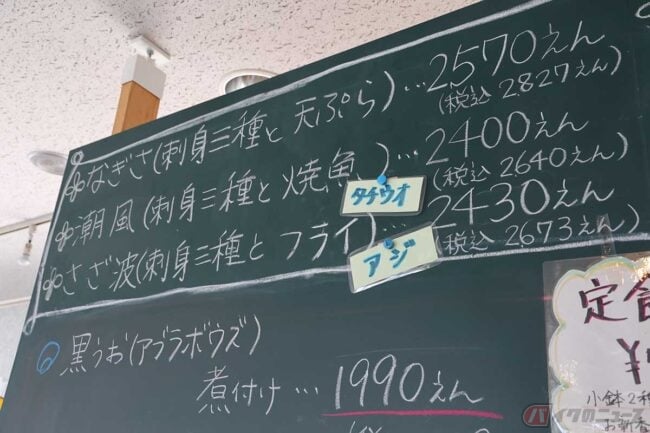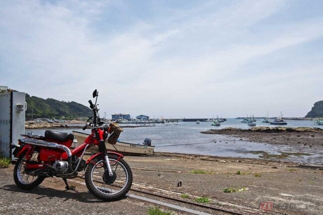 美味しいアジフライを求めて、筆者(増井貴光)が愛車のホンダ「CT110」やってきたのは、神奈川県三浦市の松輪江奈漁港です。南房総の金谷で「黄金アジ」のフライの美味しさにノックダウンされた筆者は、対岸の三浦の黄金アジも食べてみたい! ということで松輪江奈漁港にある「地魚料理 松輪」にお邪魔しました。