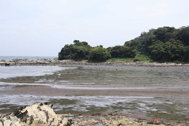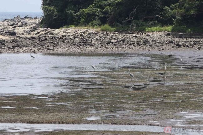 県道に出て江奈湾をぐるっと回ると、対岸に「地魚料理 松輪」が見えます。湾の西側の奥には干潟がありますが、ちょうど潮が引いている時間帯で良く見ることができました。干潟にはいろいろな生物が生息しているそうです。
