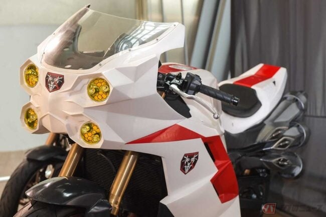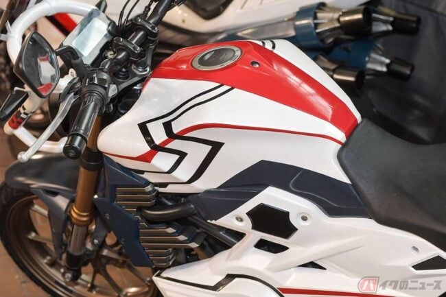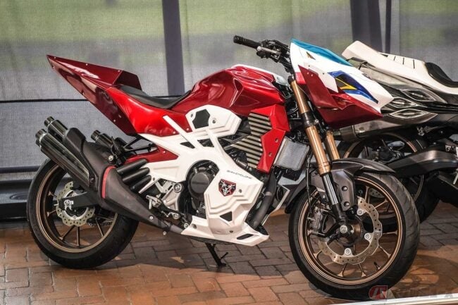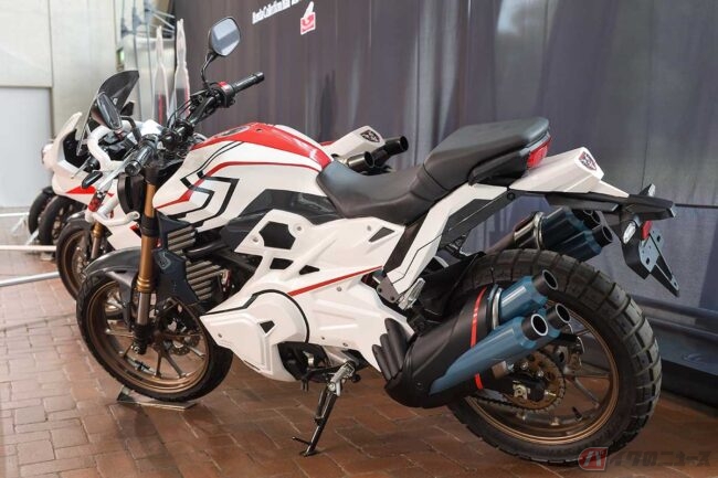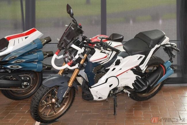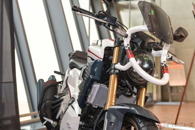 展示車両を見ると、追加された外装によって車体が大きく見えますが、ベース車両は排気量250ccクラスの単気筒エンジンを搭載するネイキッドロードスポーツ「CB250R」で、オフロードタイプのタイヤを履いています。