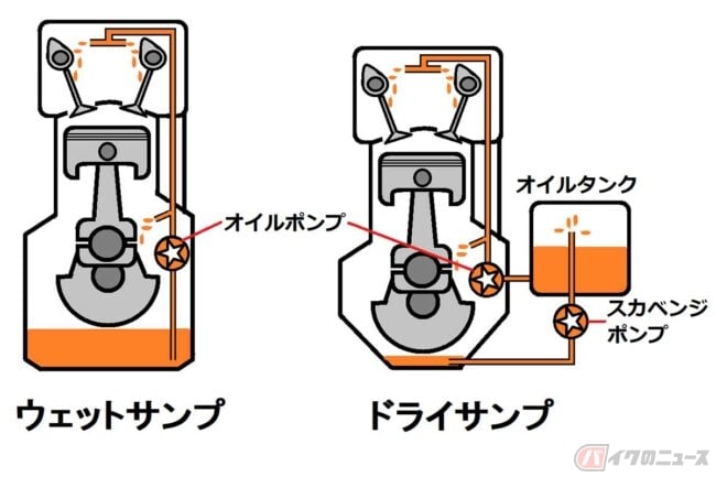 ウェットサンプはポンプがひとつでオイルタンクも不要なので、構造がシンプルなのがメリット。対するドライサンプはエンジンの下に大きなオイル溜めが不要なため、エンジンの全高を低くすることができます。