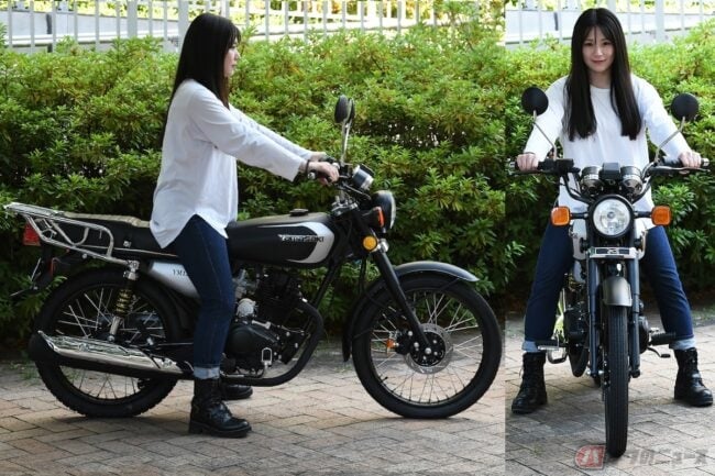 跨ってみると、シート高770mmはわたしの身長(158cm)で両足ベッタリ。125ccとはいえ、中国からの輸入車両だとどうかなと思ったけど、不安なく跨ることができたよ。