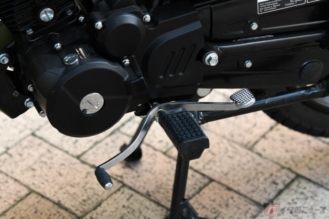 「YM-125III」には、セルスターターとキックペダルの両方が付いているよ。一発目はキックでエンジン始動してみたけど、キックペダルの経験が浅いわたしでも簡単にかかってくれた!出先で、セルの反応が悪くてエンジンかからなくなっても、キックがあるからお守りがわりとなるし安心だよね。