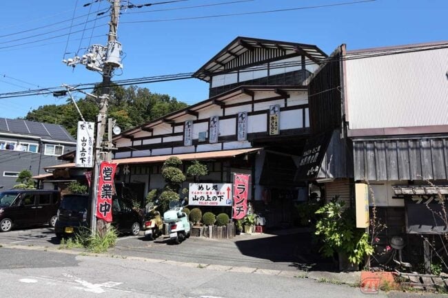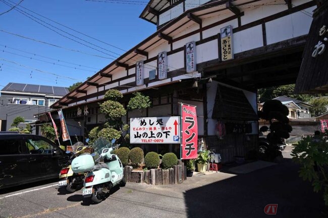 美味しいアジフライを求めて走る旅 イタリアンスクーターで行くレトロな木造建物に店を構える『めし処 山の上の下』