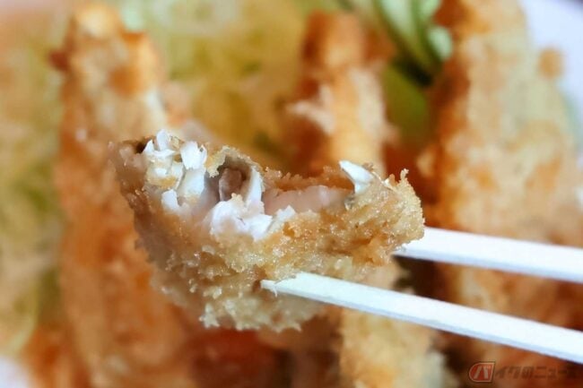 さっそく「アジフライ定食」のアジフライをいただきます。大きさは普通サイズ、揚げ色はやや薄めでしょうか。粗めのパン粉で揚げ具合はバッチリ、サクサク食感です。身はふわっとして脂の乗った美味しいアジでした。
