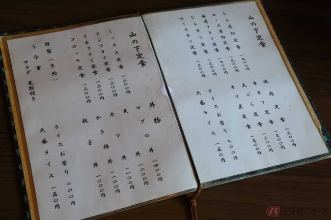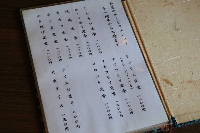 ランチタイムのピークを過ぎていたため、すんなり店に入ります。店内もレトロでカウンターとテーブル席が3卓、落ち着く雰囲気の店です。メニューを見ると「お昼のサービスメニュー」と「山の下定食・丼物」に分かれています。筆者は迷わず「アジフライ定食」、伊丹さんはヒレ・アジ・イカの「ミックス定食」、かたくなにアジフライを食べようとしないアジフライ連載担当編集のZさんは「カツ煮定食」をオーダーしました。