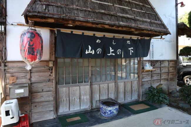 山から内房の海沿い方面へ下り、国道127号を少し北上してJR内房線「上総湊駅」近くにある目的の店「めし処 山の上の下」に到着しました。レトロで大きな木造の建物(屋敷の長屋門でしょうか?)に4軒の飲食店が並ぶ、そのうちの1軒です。国道127号を走っていると、一番手前にある「あさると」(カレー専門店らしい)という店が気になっていた建物です。