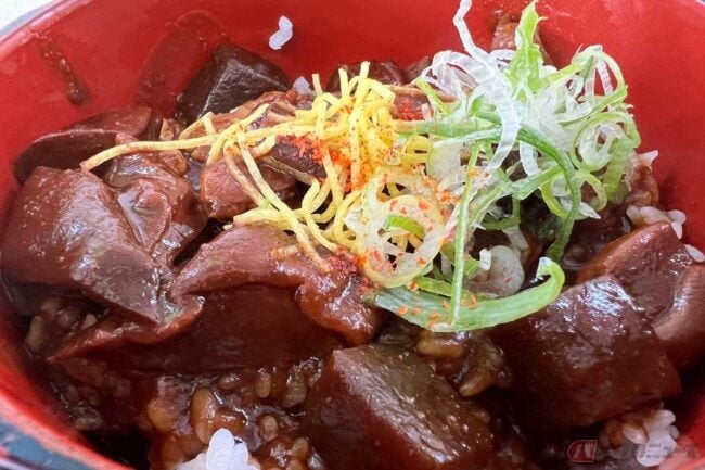どてめしはご飯にどて煮が乗っています。少し甘めに味付けられた赤味噌仕立てです。具材は大きめで臭みもなく、食べ応え十分。味噌好きならたまらないでしょう。