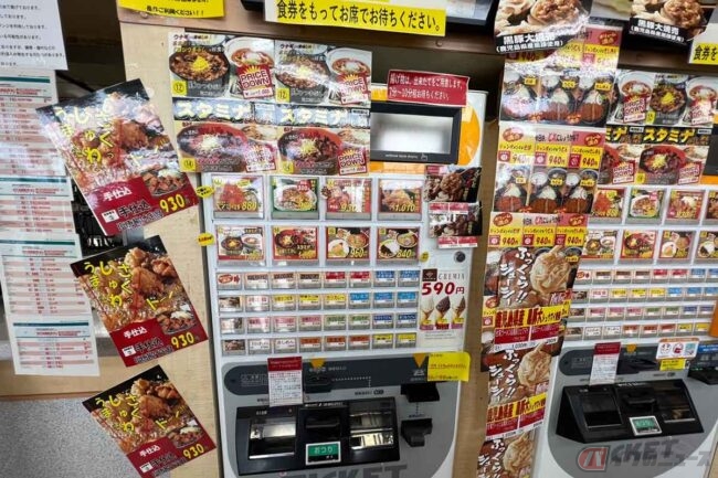 これまでに全国の様々なPAやSAのフードコートを訪れましたが、なかなかのインパクトのある券売機です。メニュー写真が壁からはみ出し、よく見ると同じものが何枚も貼られています。